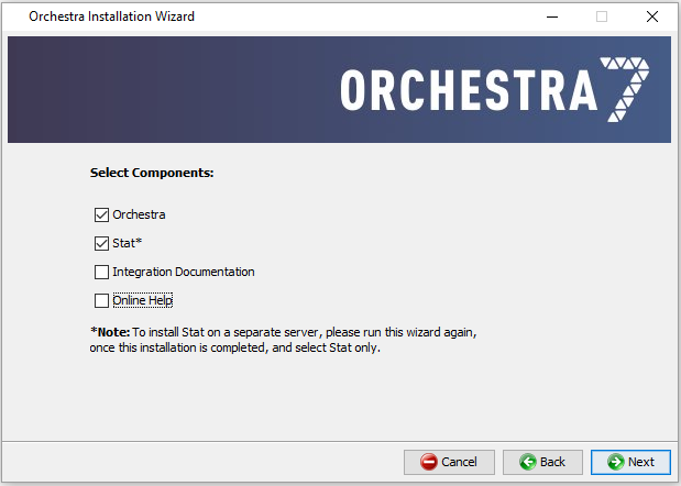 ![]() | 4. Select the wanted components. If both Orchestra and Stat are selected, they will be installed on the same server. If however, you want to install Stat on a separate server, see “Orchestra and Stat on Separate Servers” . |