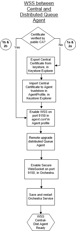 The flow chart below illustrates the steps needed to enable Websocket Secure between Central and distributed Queue Agent. These steps are described in more detail below.