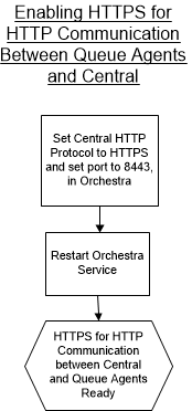 The following flow chart illustrates the steps needed to enable HTTPS for HTTP communication between Queue Agents and Central. The steps are described in more detail below: