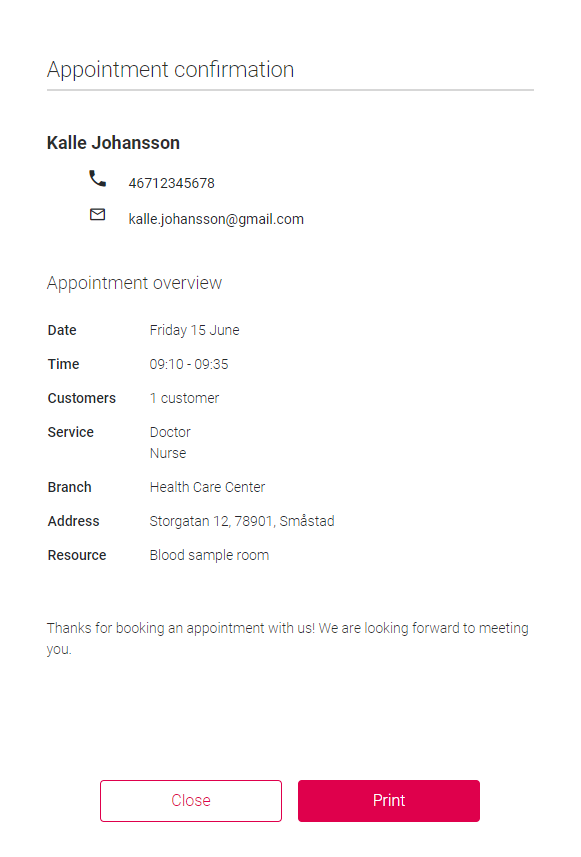 Here, you can press Close to return to the booking page, or Print to print the confirmation.