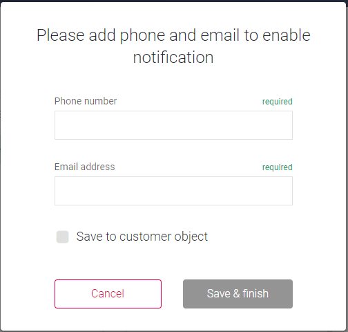 Here, you have the possibility to add a phone number and/or email address, which either can be used temporarily, or saved to the customer object